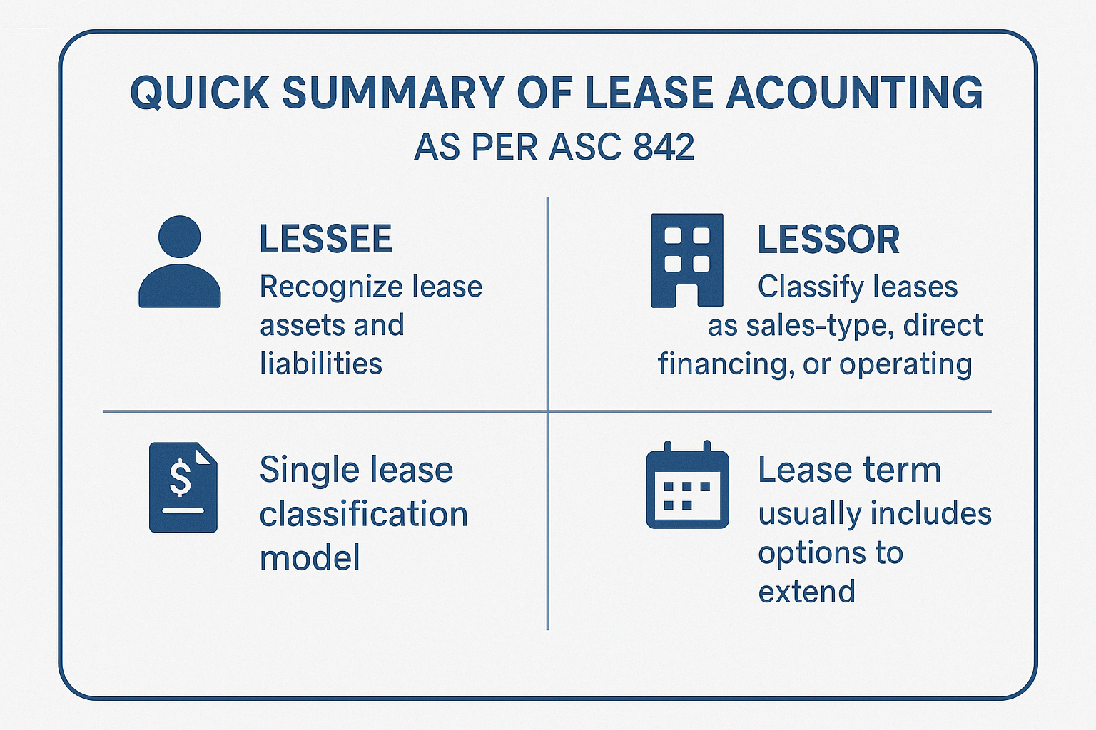 Lease accounting affects reported assets, liabilities, and profitability metrics. Incorrect lease treatment can lead to misstated financial statements, failed lender covenant tests, delayed audits, and repeated CPA adjustments. Service contracts often contain embedded leases that are overlooked. Businesses that rely on generic bookkeeping or cash-basis records are especially exposed to ASC 842 non-compliance. Accurate lease accounting is now a compliance necessity, not an optional accounting refinement.